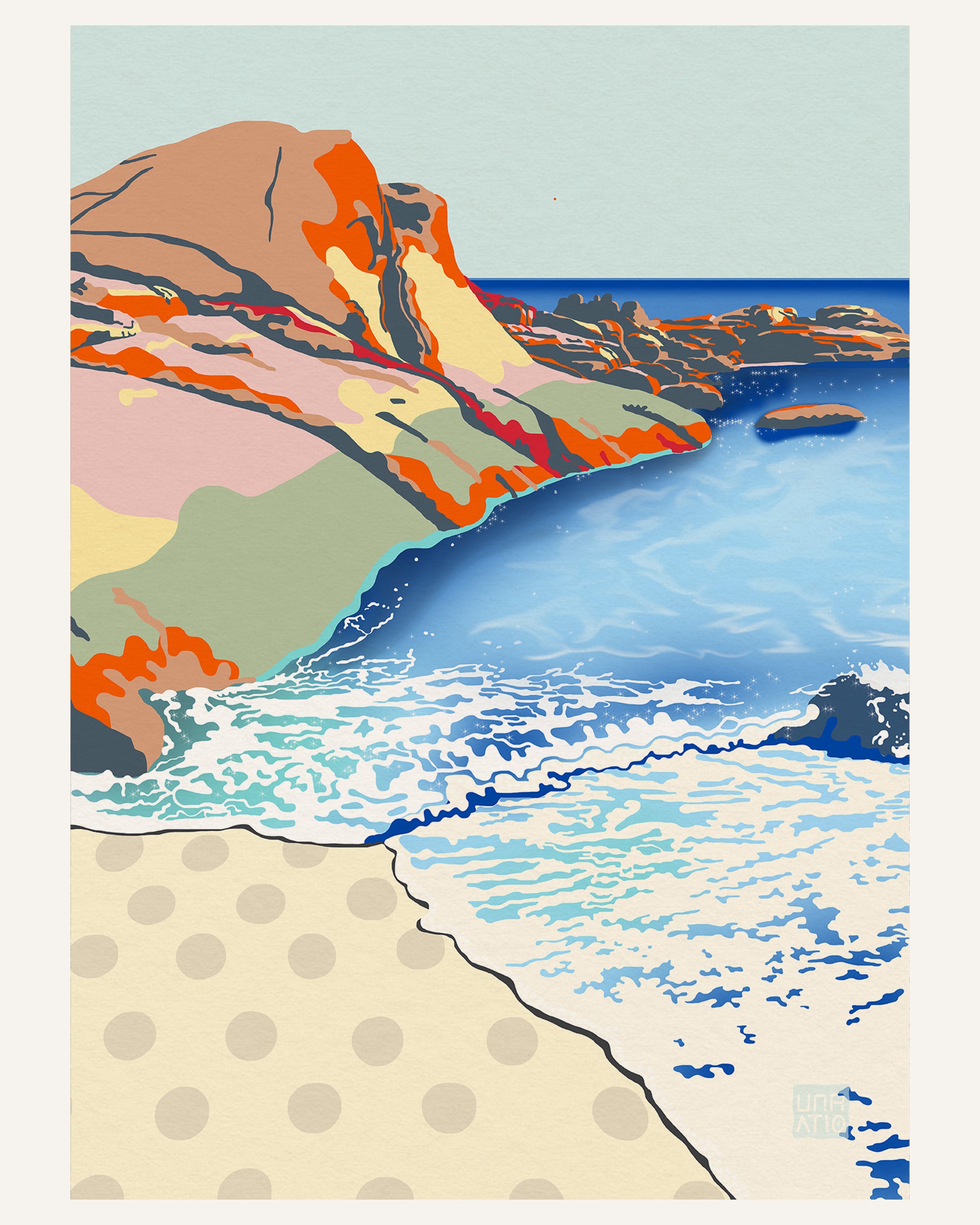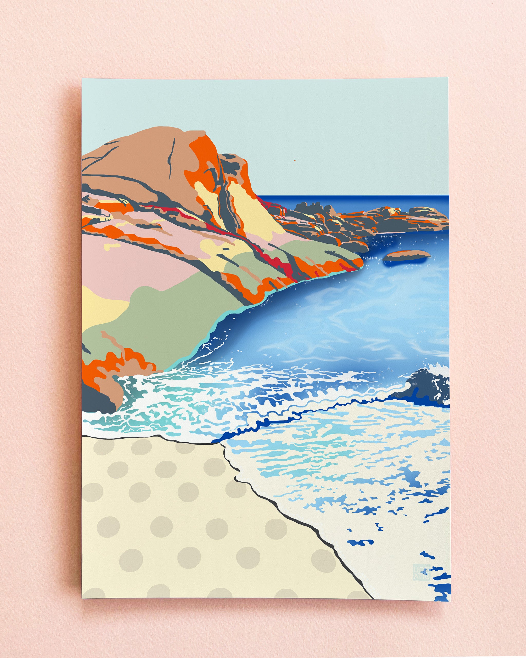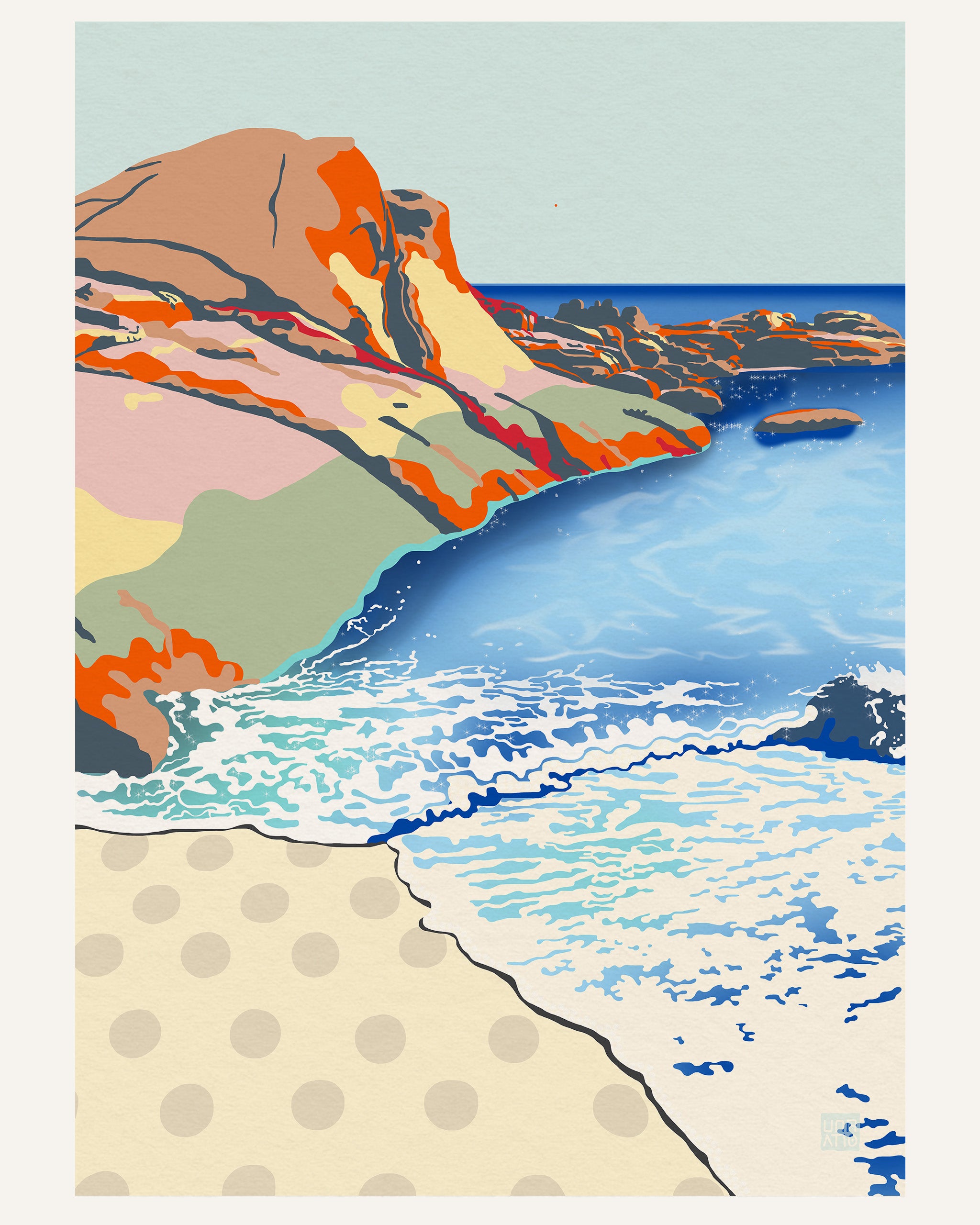 Moss Green Clementine is an original drawing created by Isa June in her coastal studio. The composition features waves washing on a polka dot sandy beach and large rocky coastline, in a palette of coastal blue and lemon butter.