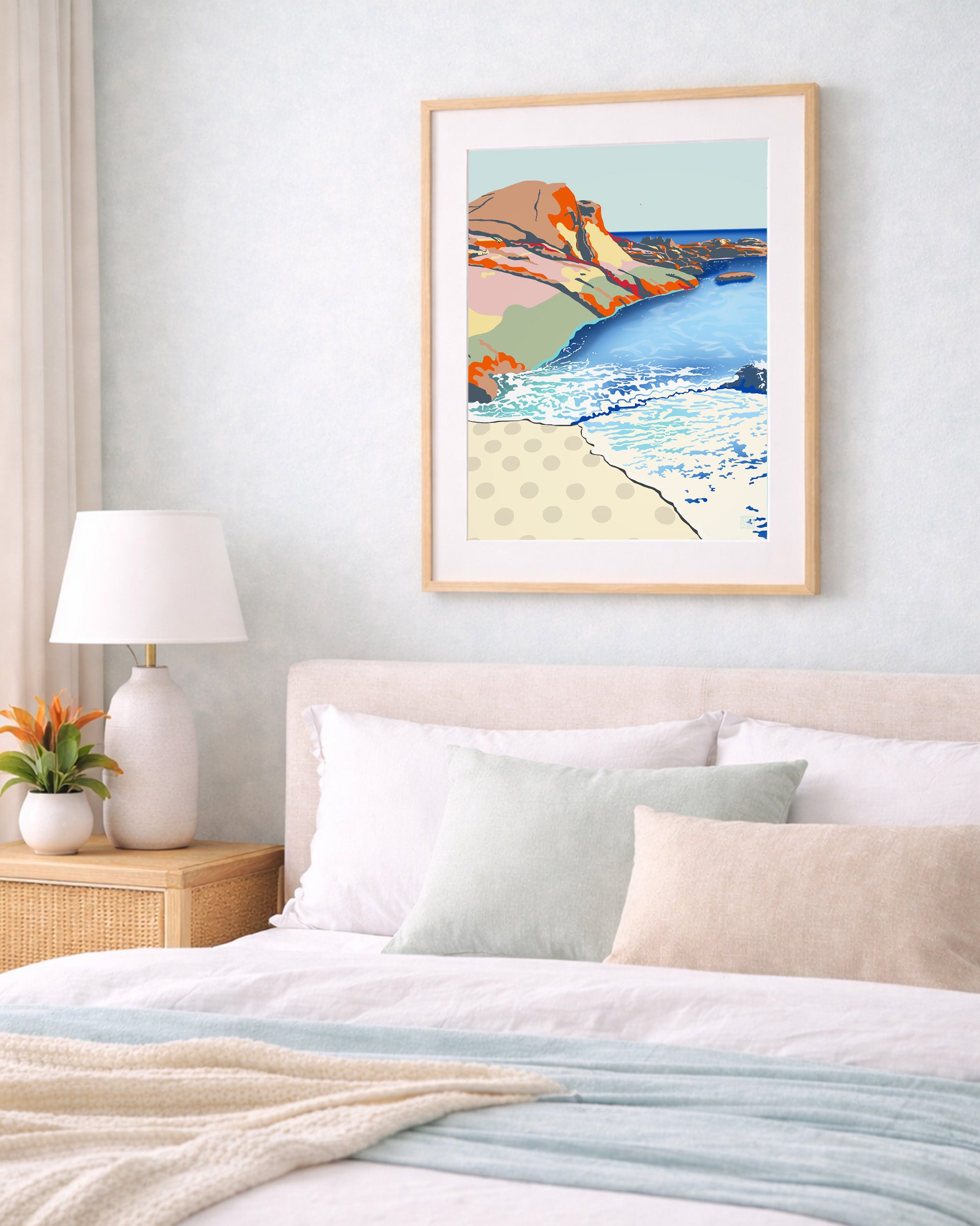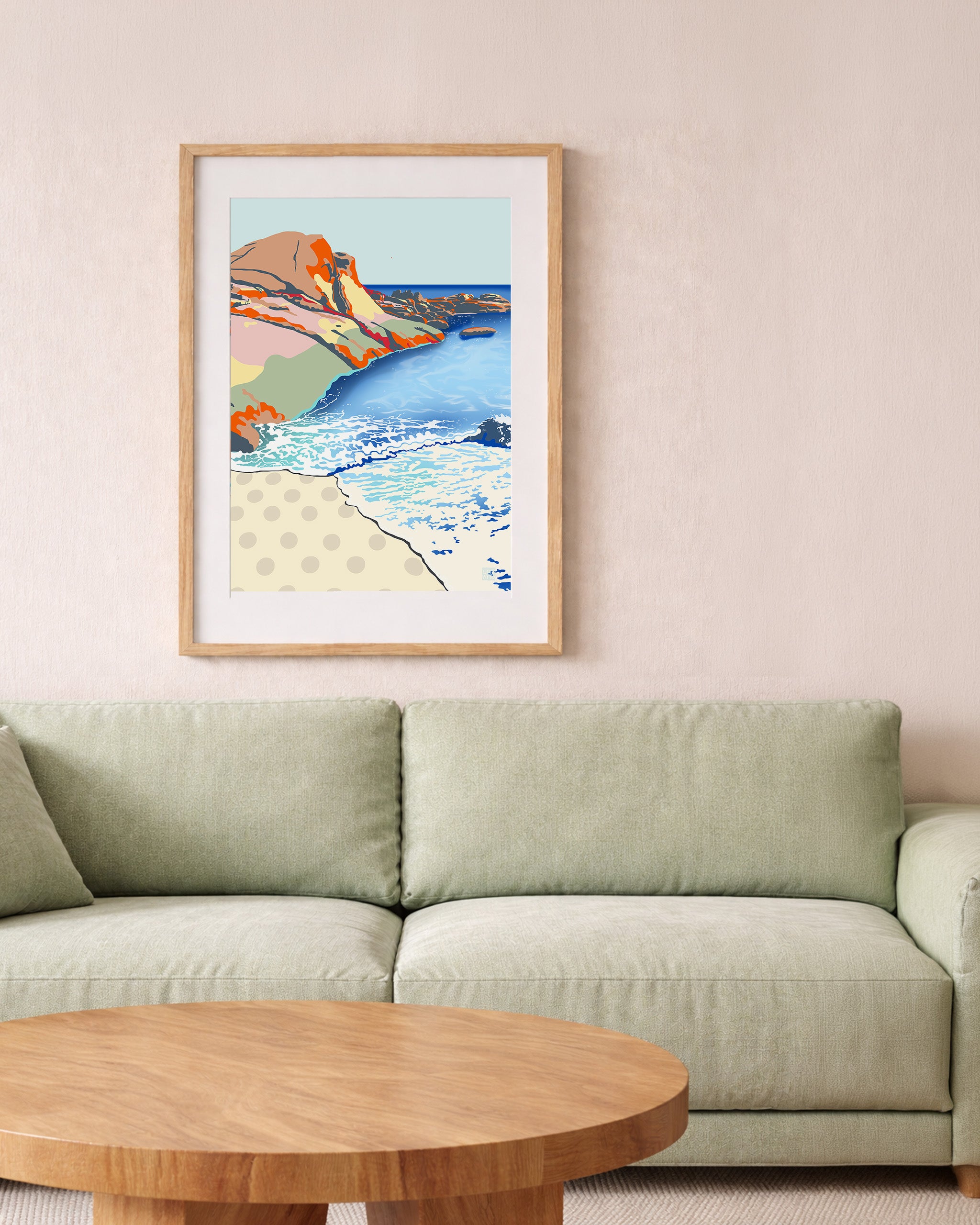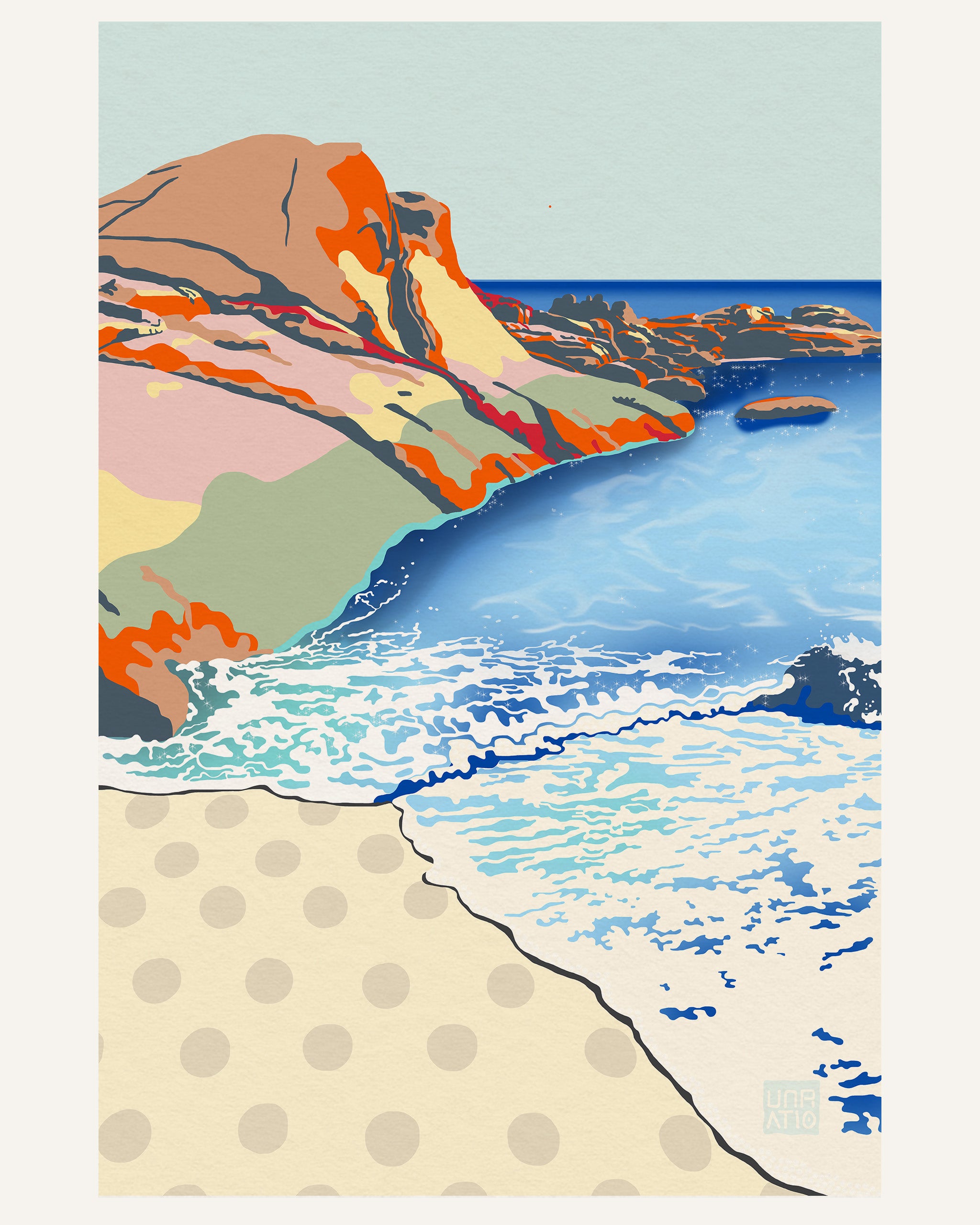 Moss Green Clementine is an original drawing created by Isa June in her coastal studio. The composition features waves washing on a polka dot sandy beach and large rocky coastline, in a palette of coastal blue and lemon butter.