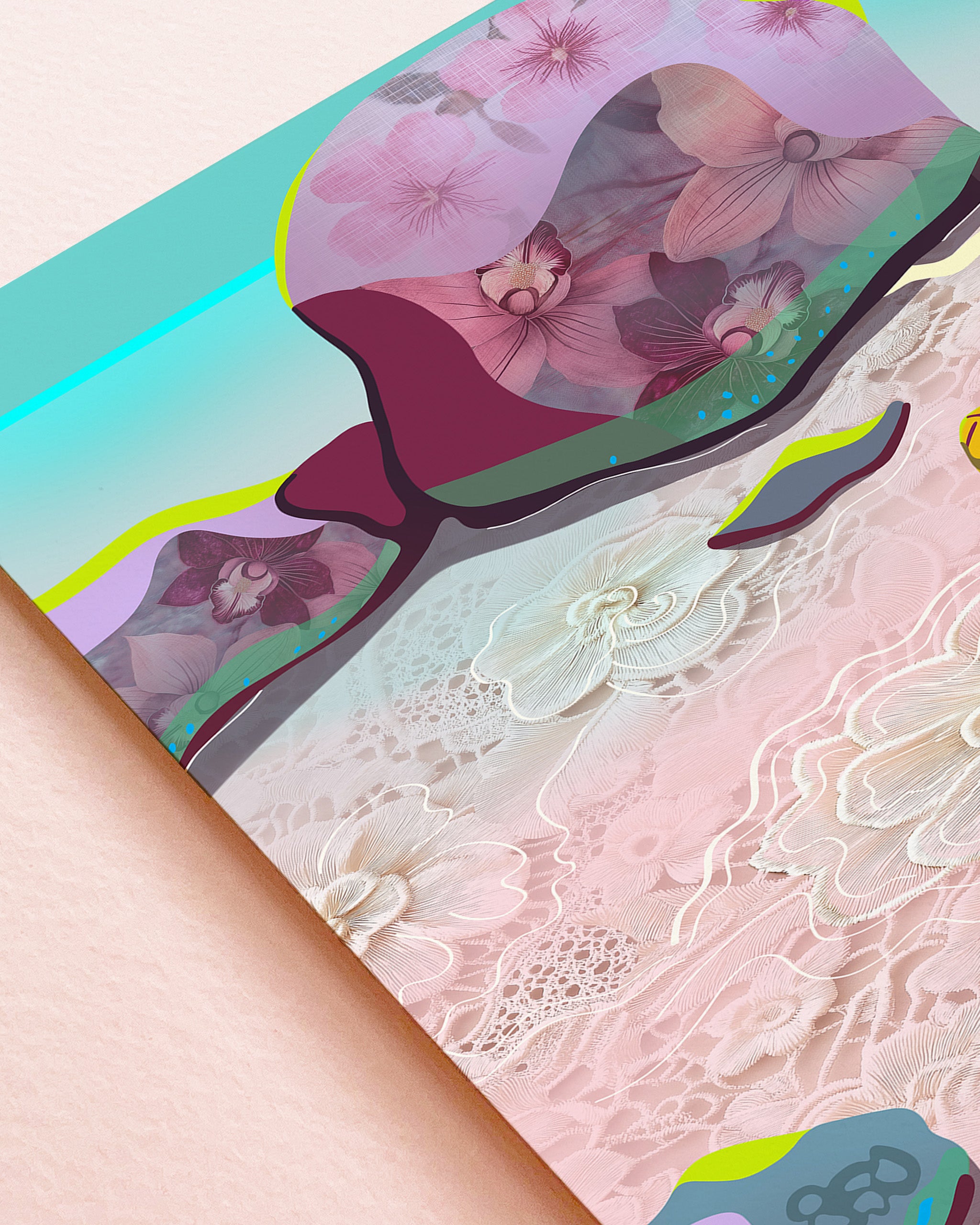 More Than You Knew is a layered digital collage series blending botanical form, textile pattern, and soft geometry in a palette of peach, seafoam, sunlit gold, and washed coastal blues. Inspired by tropical island landscapes where palms, shells, and floral fragments gather into compositions that feel vivid, abundant, and slightly dreamlike.