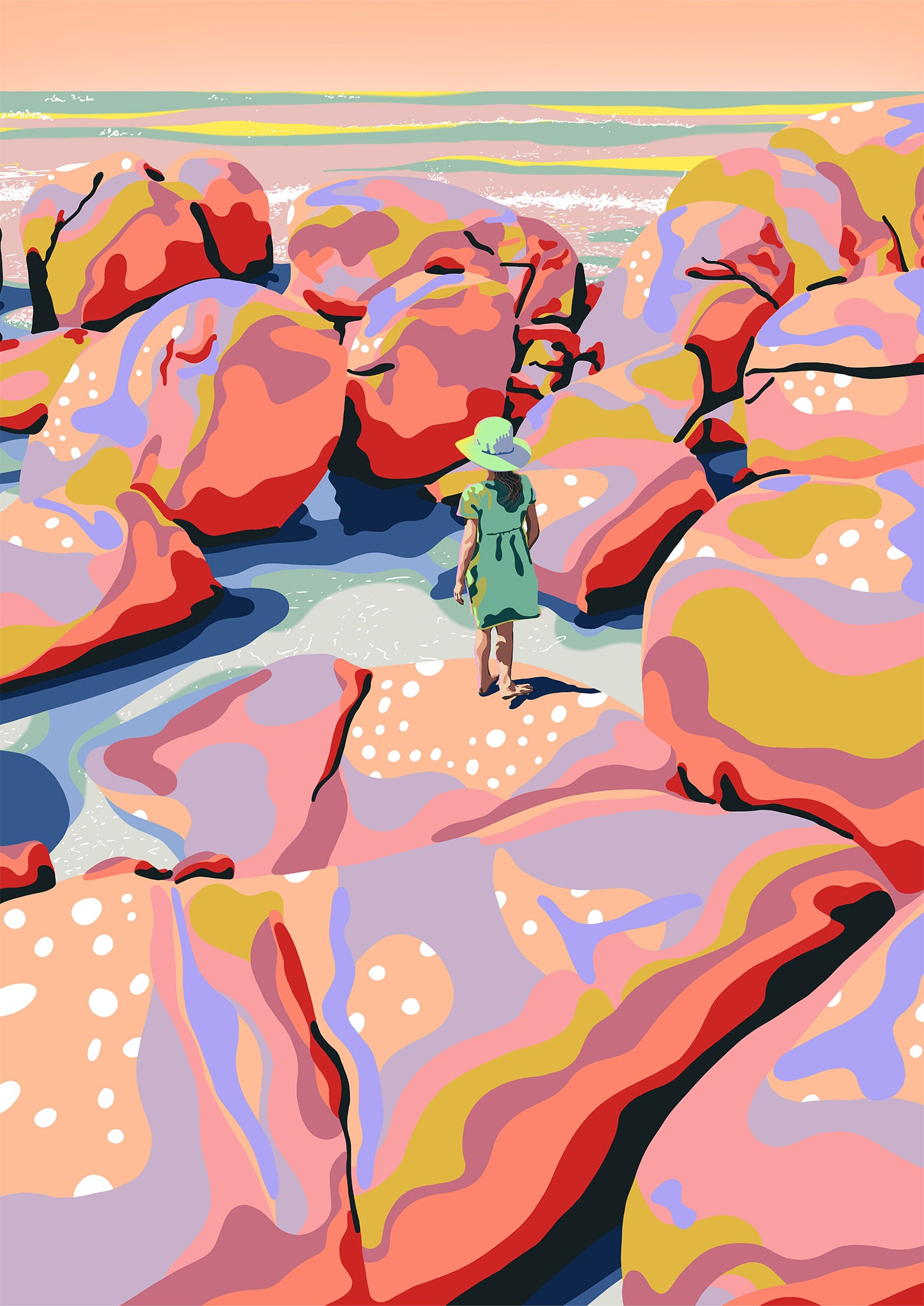 A premium Giclée print of my original hand-drawn illustration, Barrel Beach.