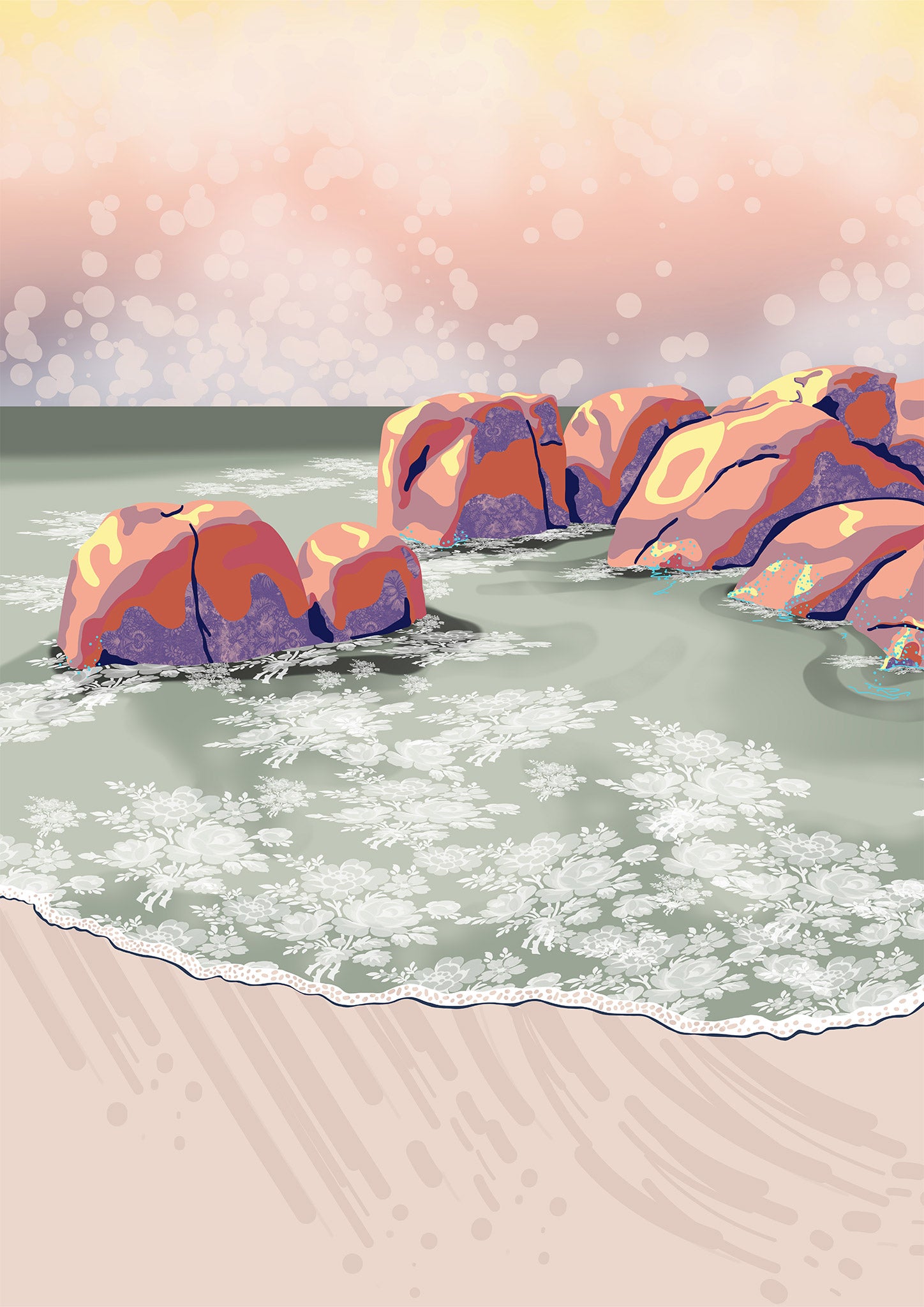 A coastal landscape featuring soft blush pastels and teal greens with abstract waves washing on the beach in a pretty floral pattern.
