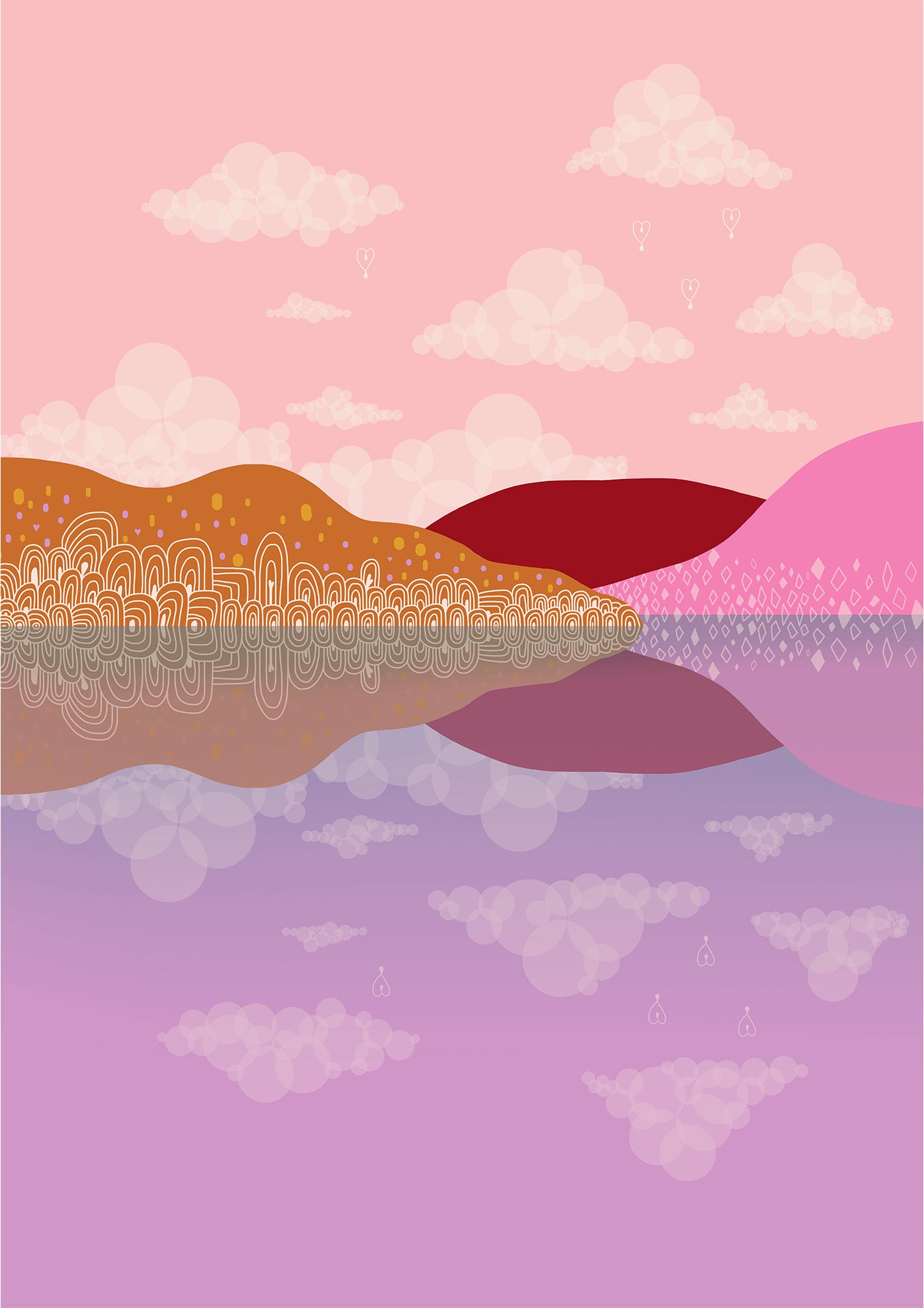 A minimalist abstract landscape with a nordic boho aesthetic, depicting mountains and clouds reflecting into a lake with tribal details.