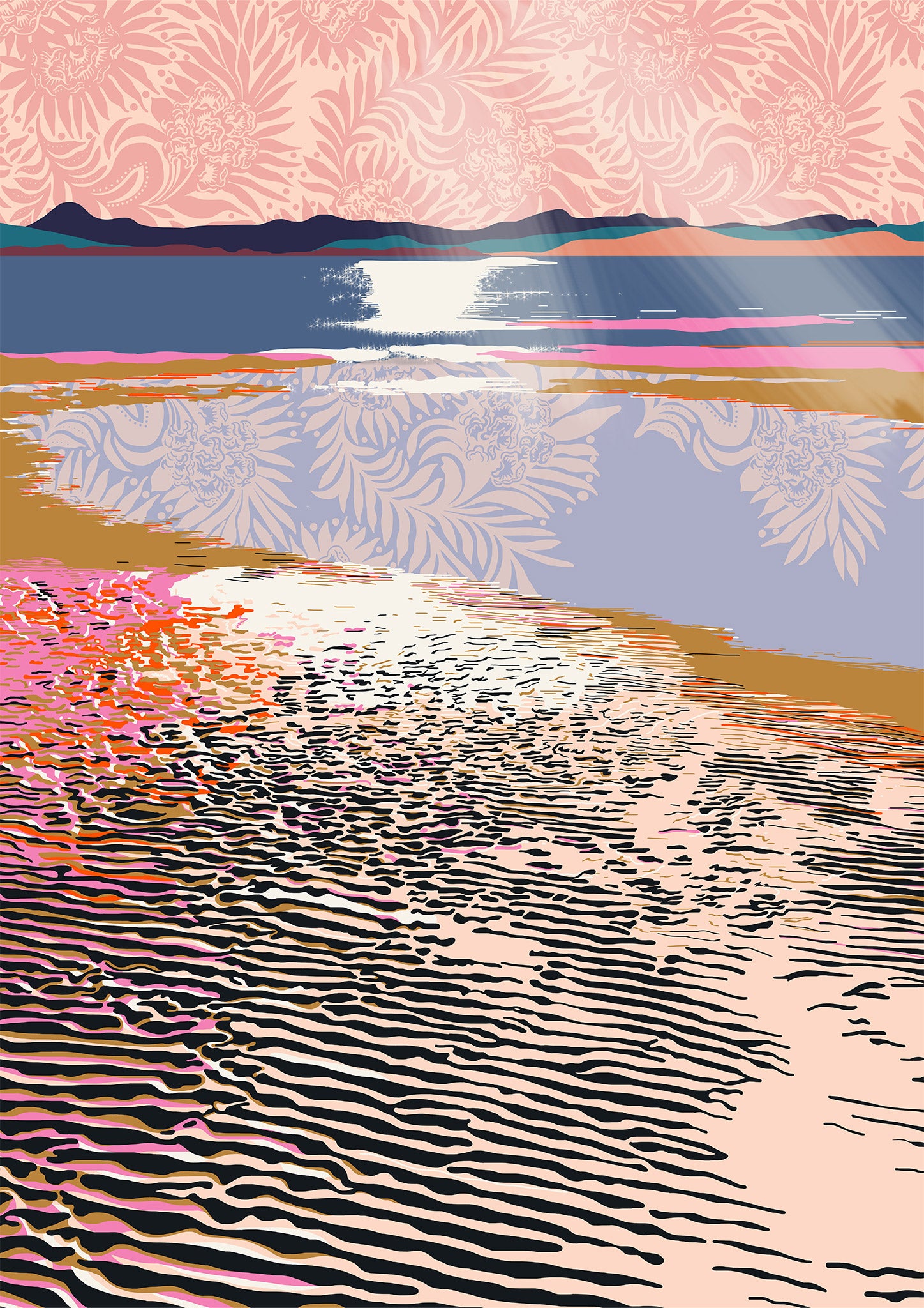 Abstract sunset illustration of sunlight and water over rippled sand with art deco flowers reflecting from the sky.