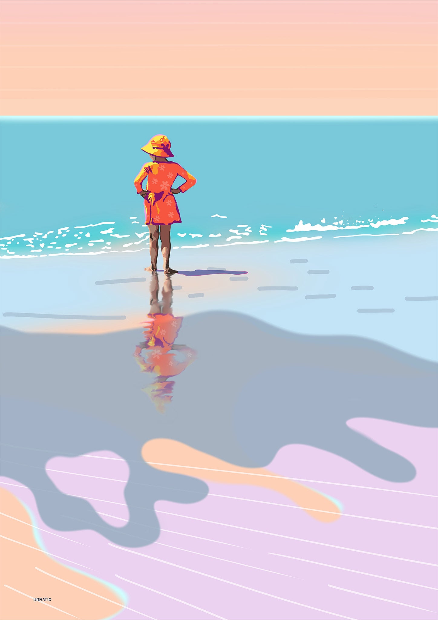 A modern beach illustration with summer childhood nostalgia, in pastel orange, blues and light purple.